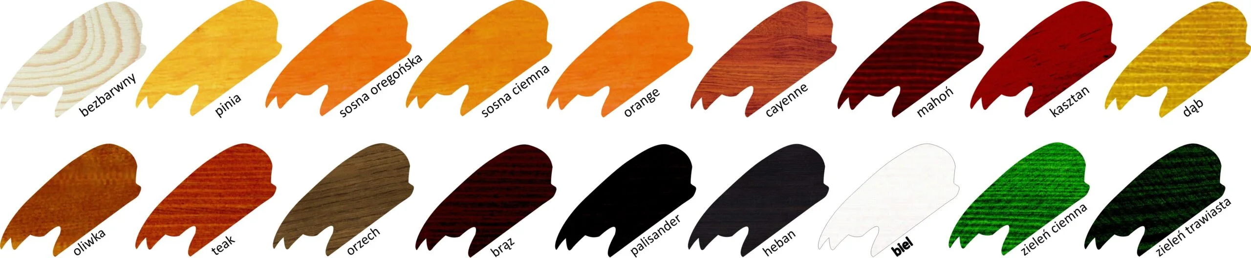 | Barwa po utwardzeniu: | Bezbarwny, Biały, Brąz, Cayenne, Dąb, Grafit, Heban, Kasztan, Mahoń, Oliwka, Orange, Orzech, Palisander, Pinia, Sosna ciemna, Sosna oregońska, Teak, Zieleń ciemna, Zieleń trawiasta |
